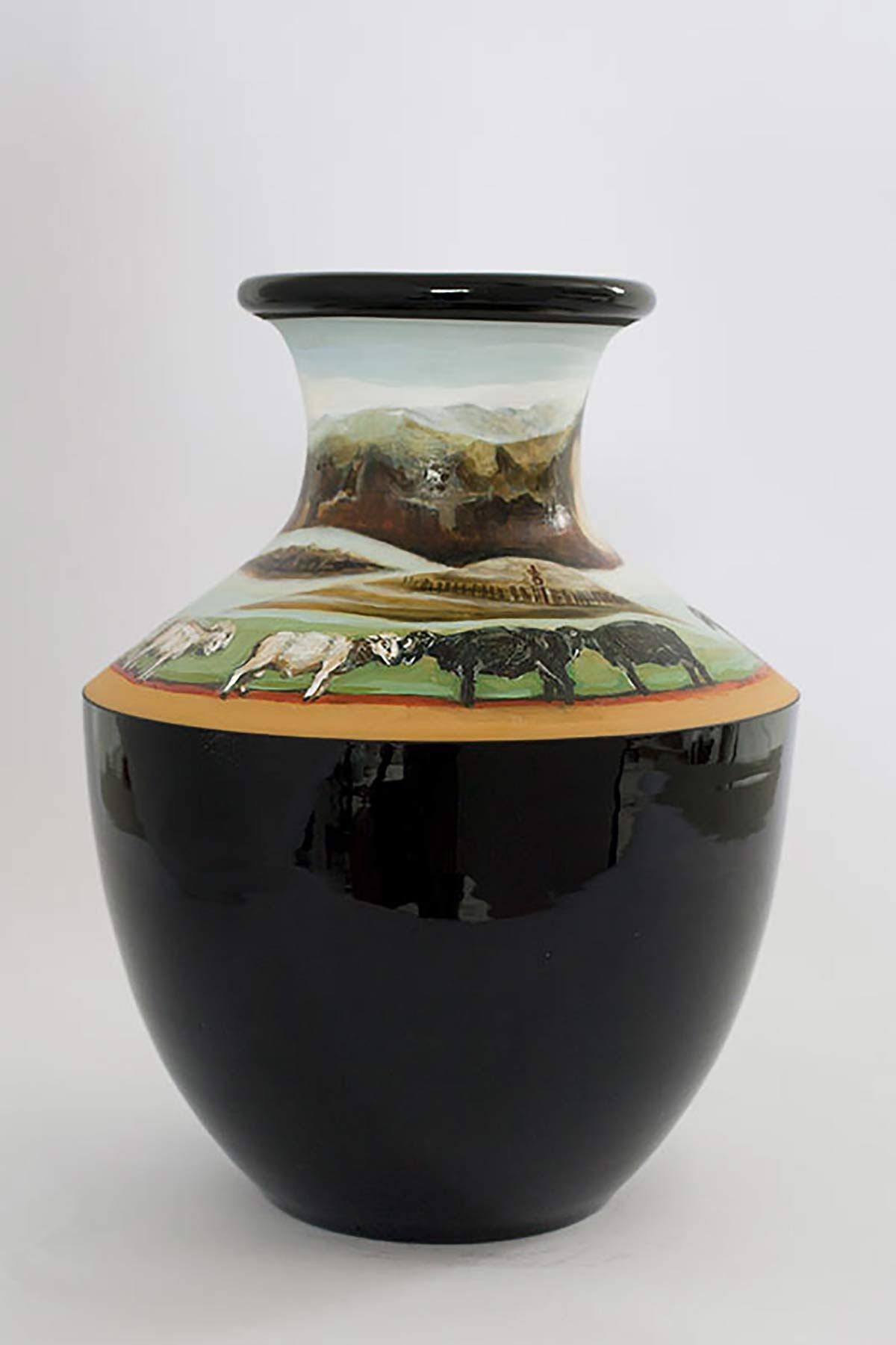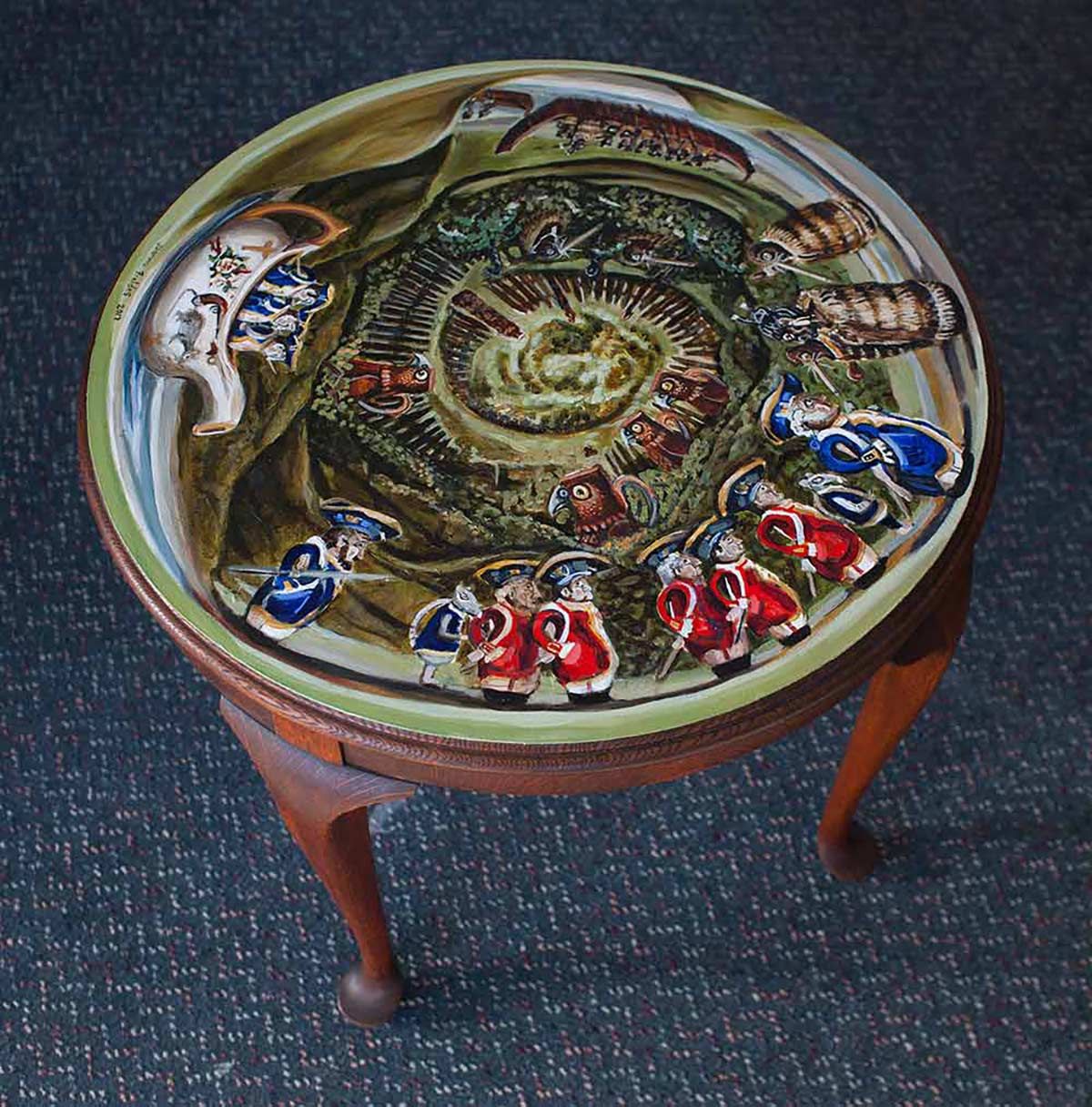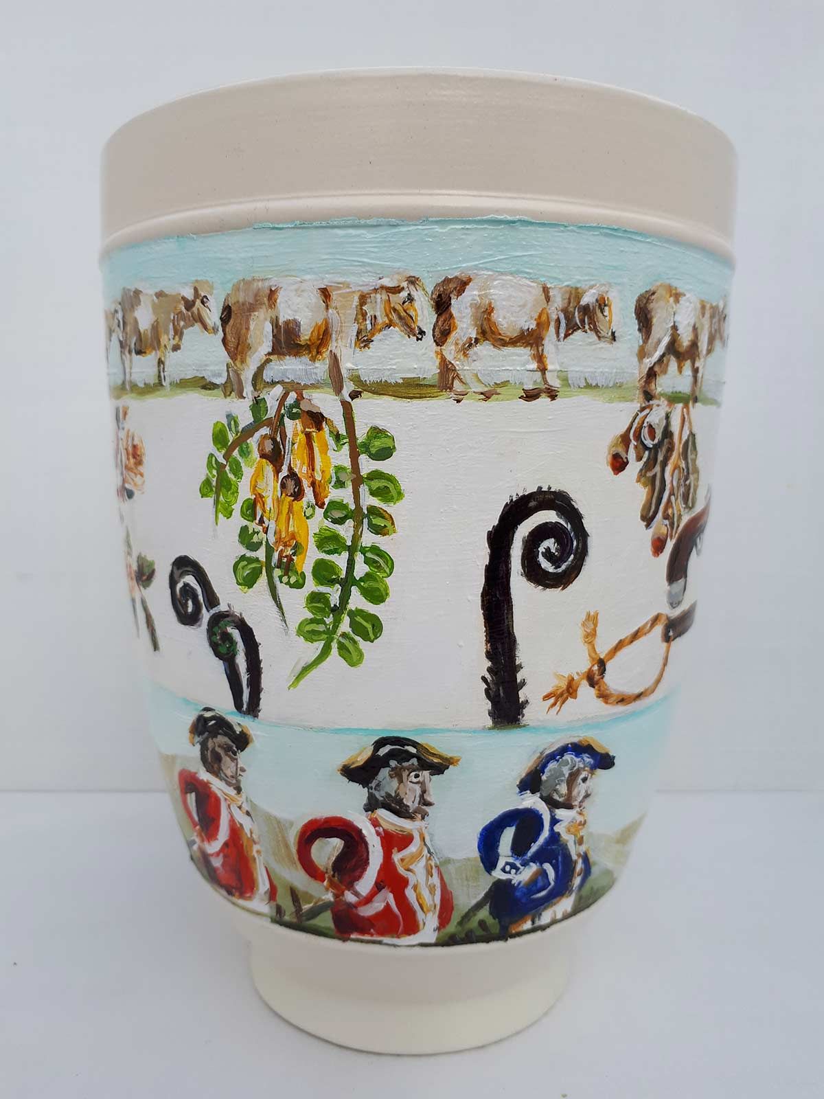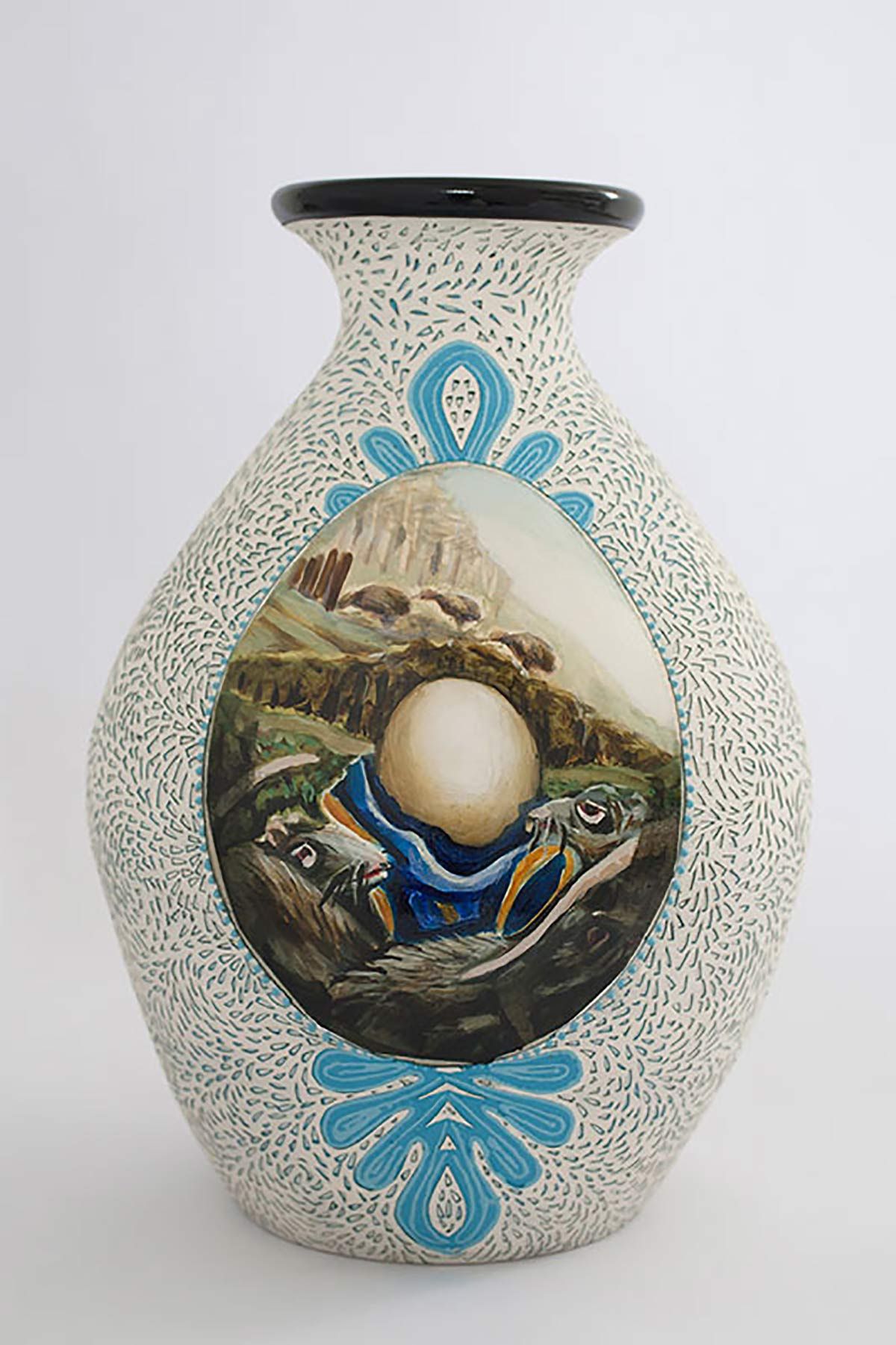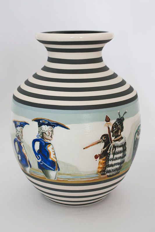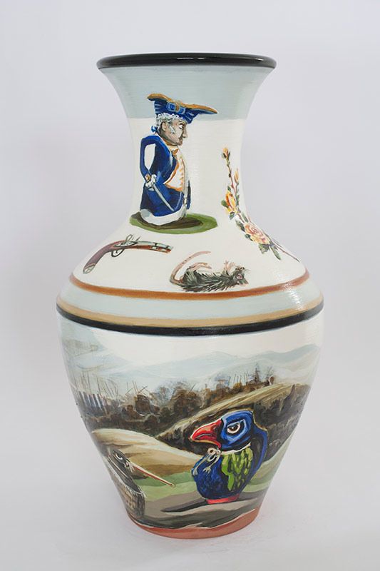The scenarios depicted in Fieldes’ paintings blend historical ‘truths’ with fanciful, surrealist visions. Ceramic vessels, gravy jugs, urns and egg cups become containers for history, memory and meaning. She references existing ceramics and embellishes them creating her own designs. The vessels are abundant with wildlife and also loaded with historic and cultural ideas.