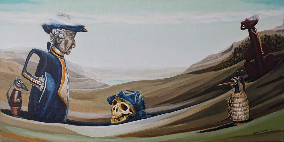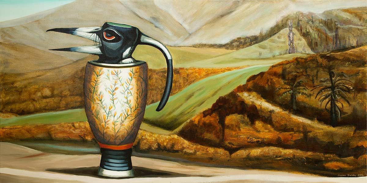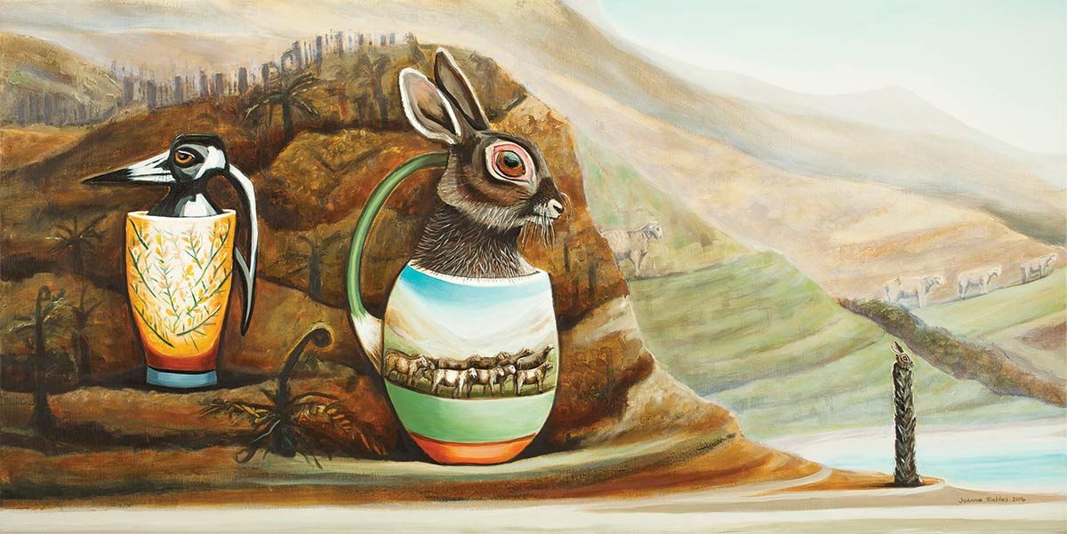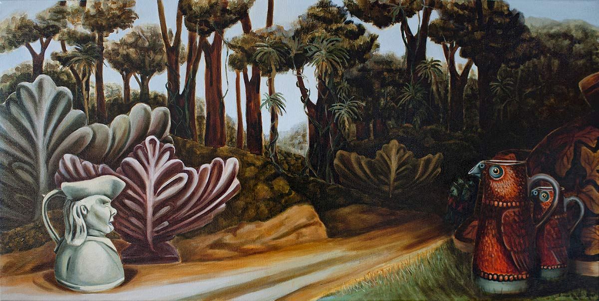 Papakura Art Gallery presents a new exhibition of oil paintings by artist Joanna Fieldes, with works selected from the last 10 years of her art practice. Recent works are based on both south and west Auckland locations. Those works are accompanied by landscape paintings based on her memory of places across New Zealand. These paintings provide a backdrop for a cast of characters, who combine and merge their shape with iconic New Zealand ceramics. These hybrid creatures are bound by the push and pull of their relationships.