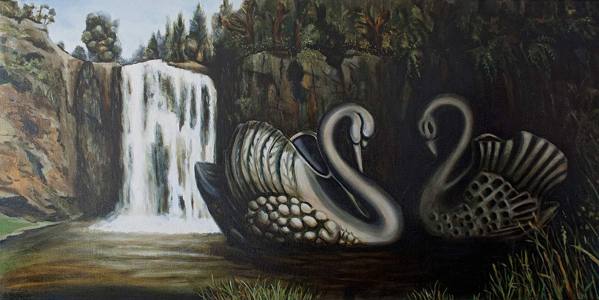 Fieldes’ ideas around land, history and domestic objects are influenced in part by her upbringing on a farm. Her current local interest is in the ceramic studios that were based in Takanini and Drury, as well as studios in west Auckland. Landmarks and places are recognisable. In Paratutae Island, (guarding the northern shores of the Manukau Harbour) an over-sized golden hued bowl sits, upside down, at the entrance to Manukau harbour. In Hunua Water Fowl iconic Crown Lynn swans settle on the Hunua Falls. These locally made ceramic forms challenge the typical depiction of the pictorial New Zealand landscape.