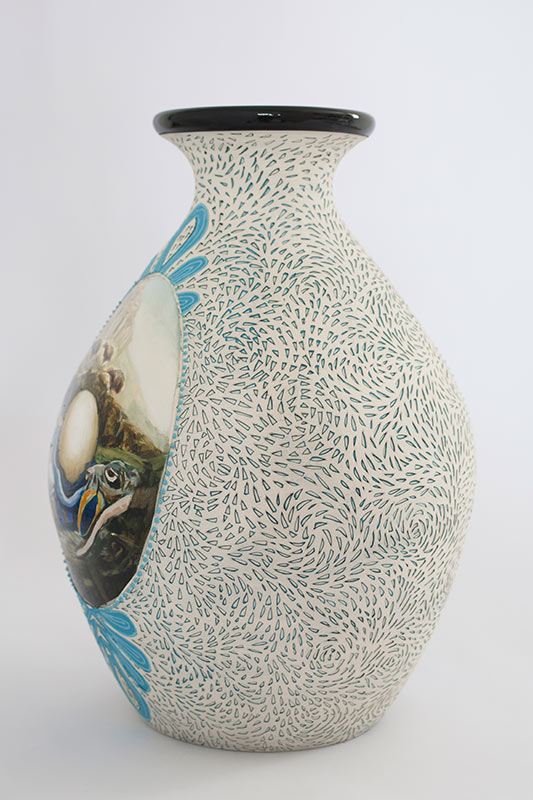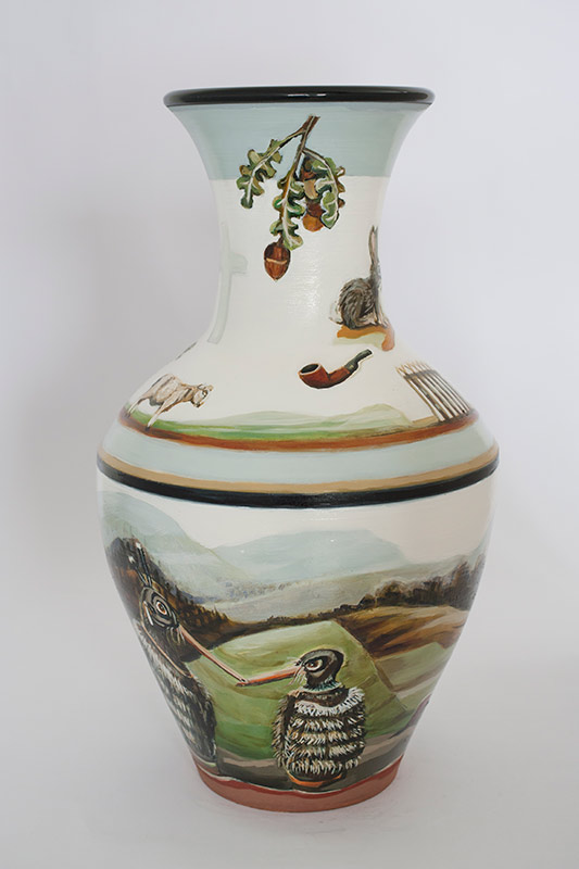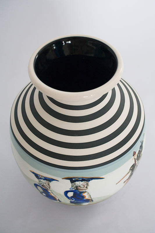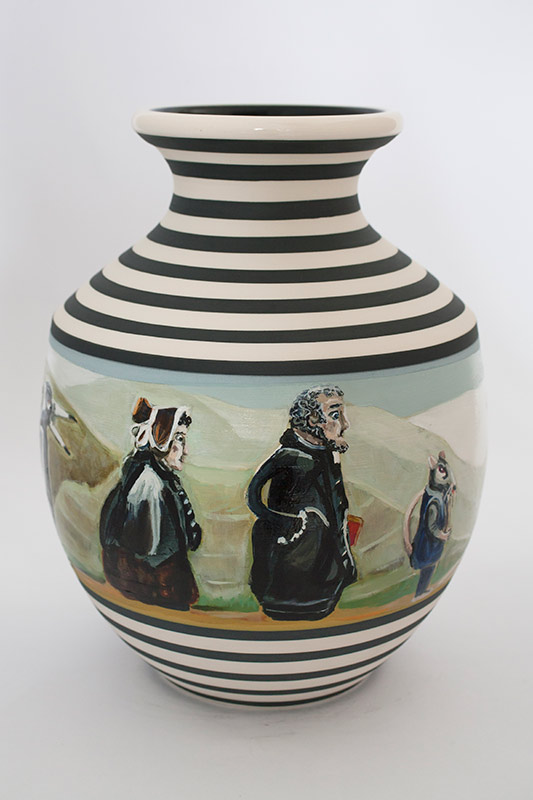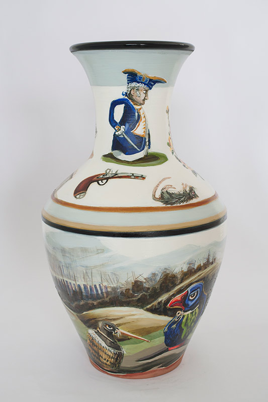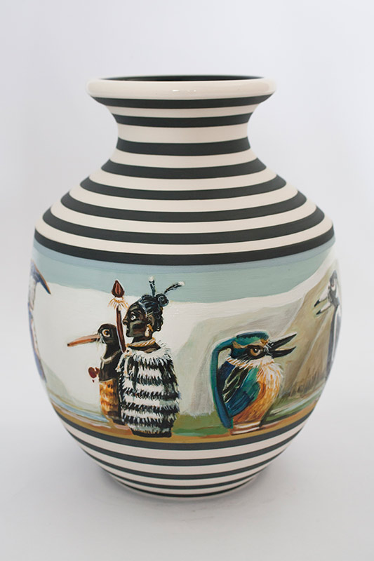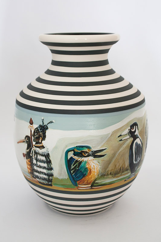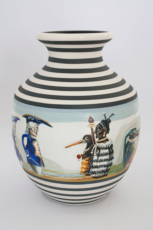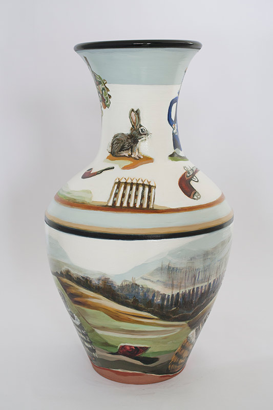 The vases created by Fran Maguire provide ideal medium and form for the expression, through Joanna Fieldes’ painting, of their shared ideas concerning the imported versus the indigenous. Containers of history link past to present while pointing to the challenges and consequences that exist today because of opportunities presented in the past.