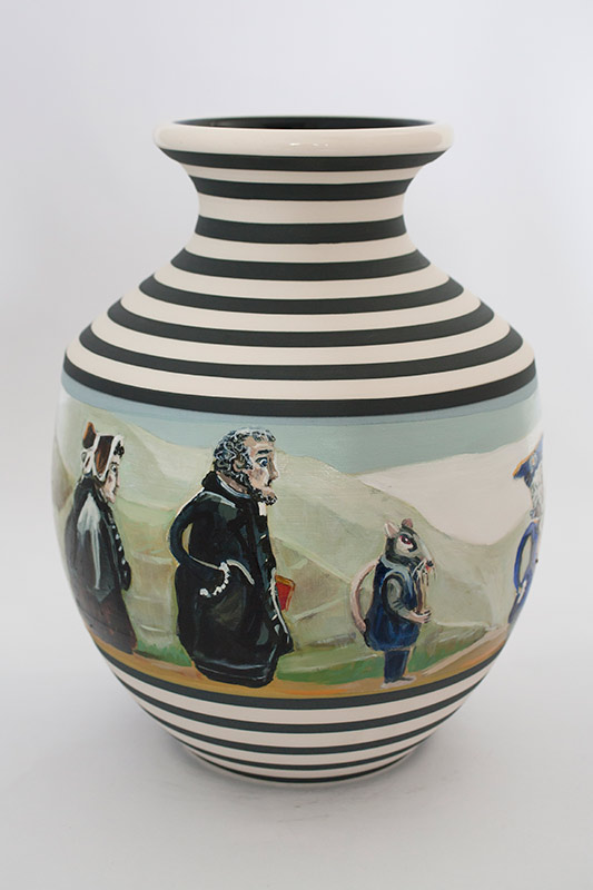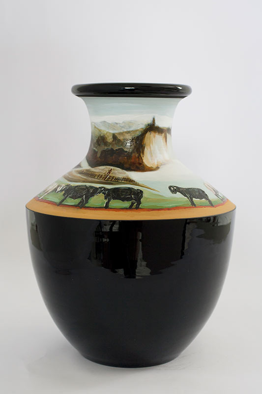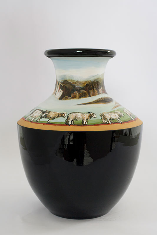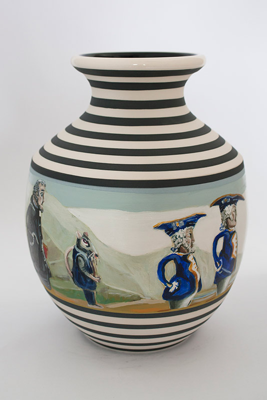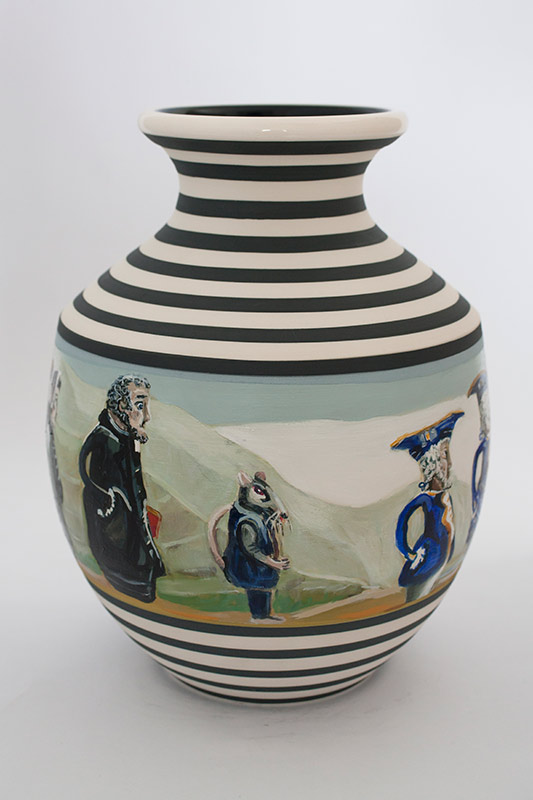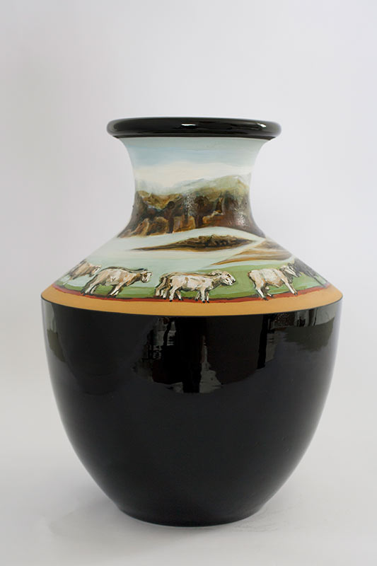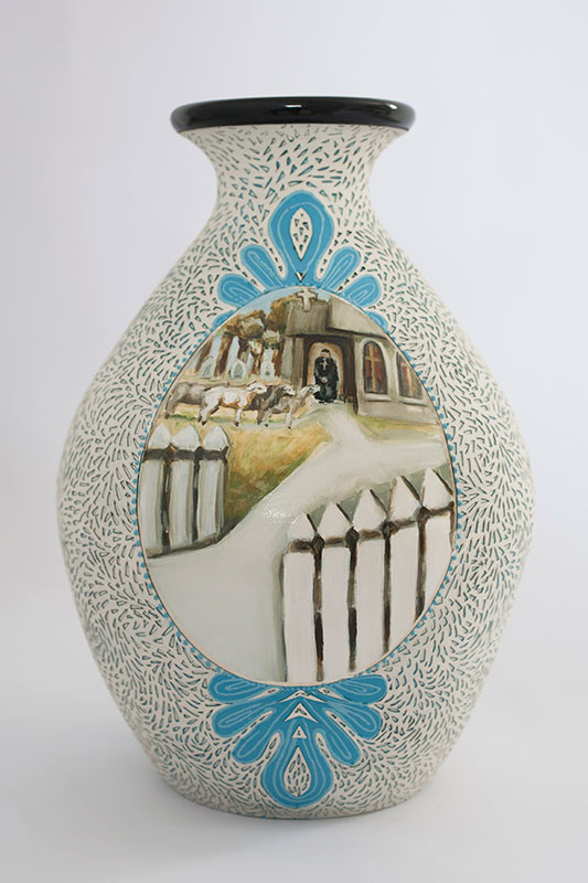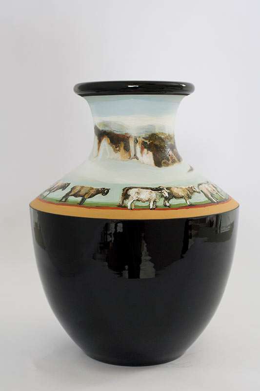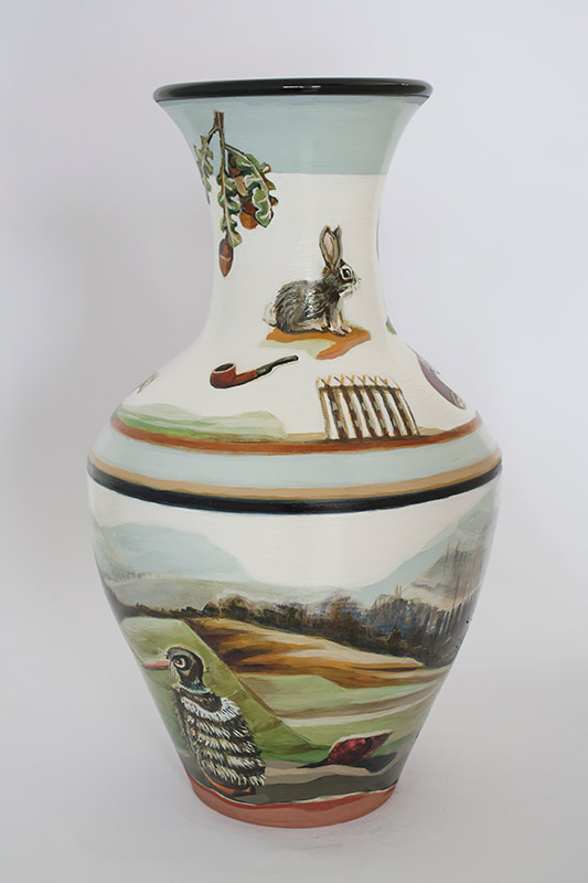 The vases created by Fran Maguire provide ideal medium and form for the expression, through Joanna Fieldes’ painting, of their shared ideas concerning the imported versus the indigenous. Containers of history link past to present while pointing to the challenges and consequences that exist today because of opportunities presented in the past.