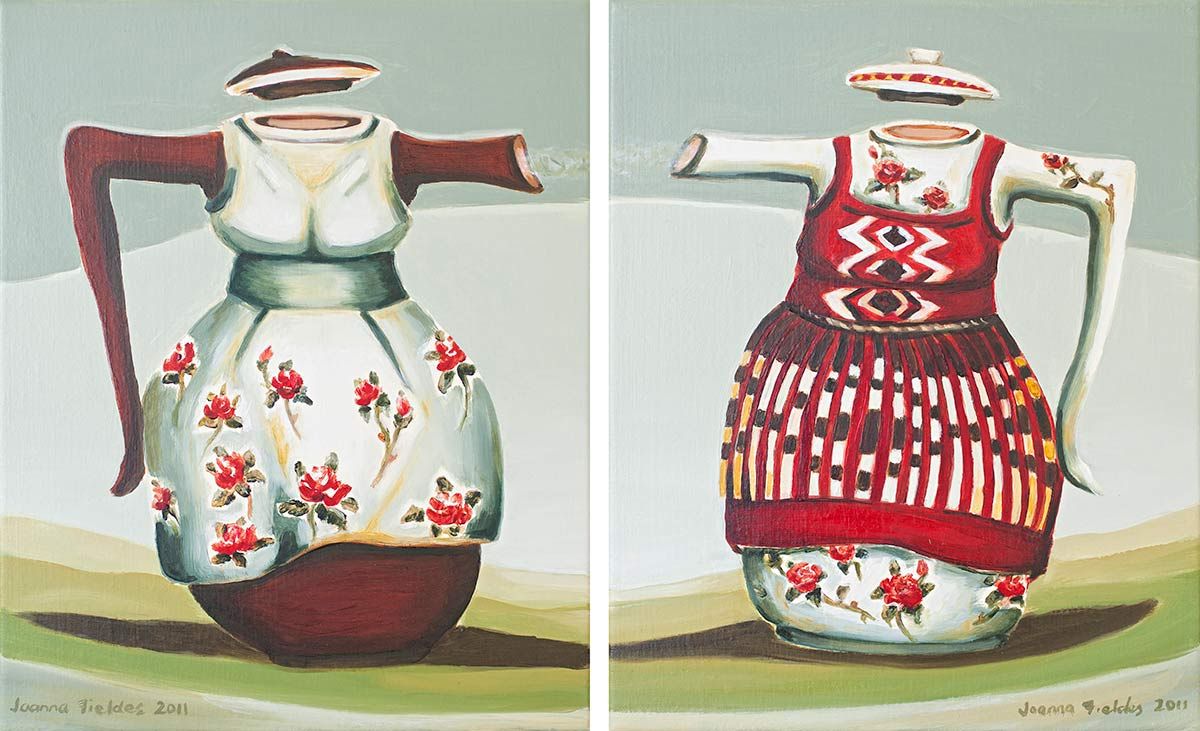 The scenarios depicted in Fieldes’ paintings blend historical ‘truths’ with fanciful, surrealist visions. Ceramic vessels, gravy jugs, urns and egg cups become containers for history, memory and meaning. She references existing ceramics and embellishes them creating her own designs. The vessels are abundant with wildlife and also loaded with historic and cultural ideas.