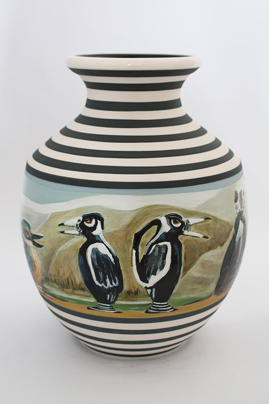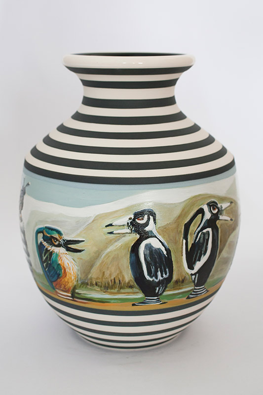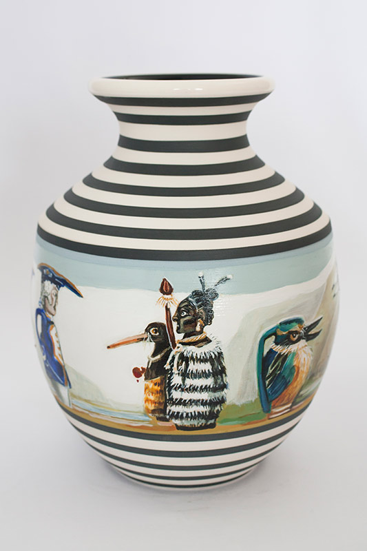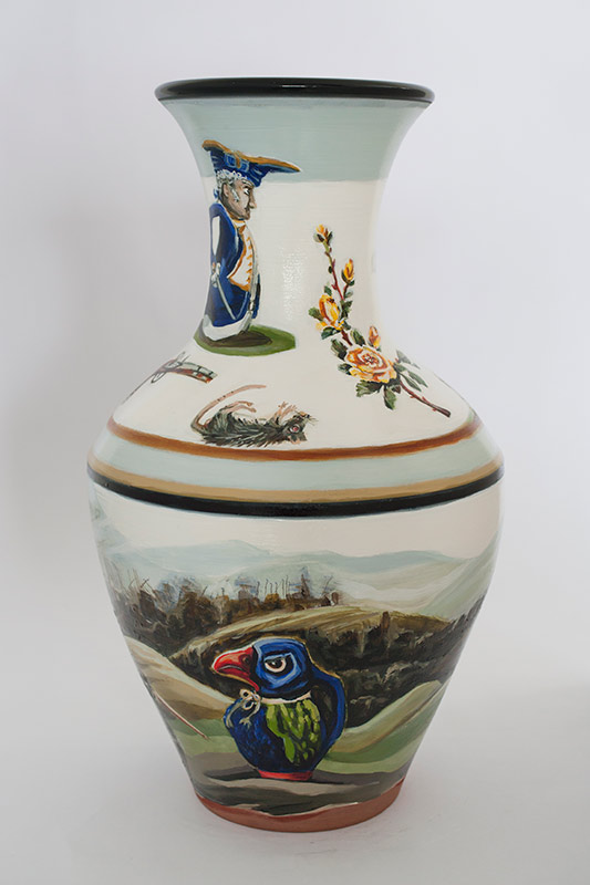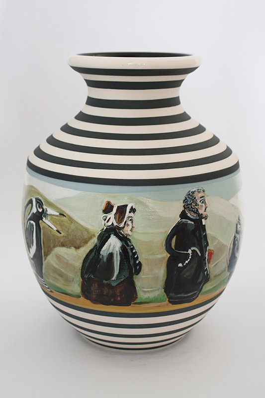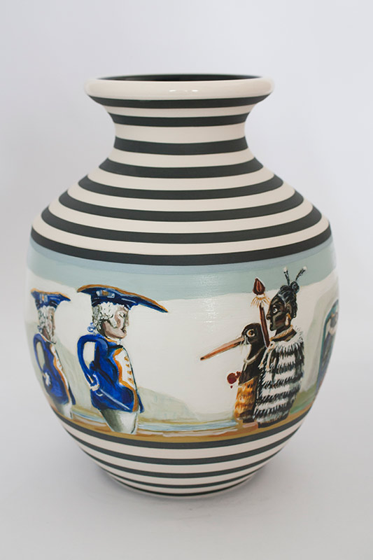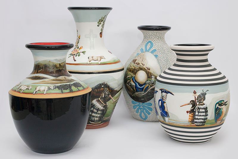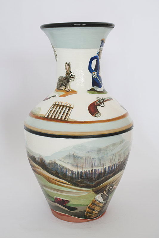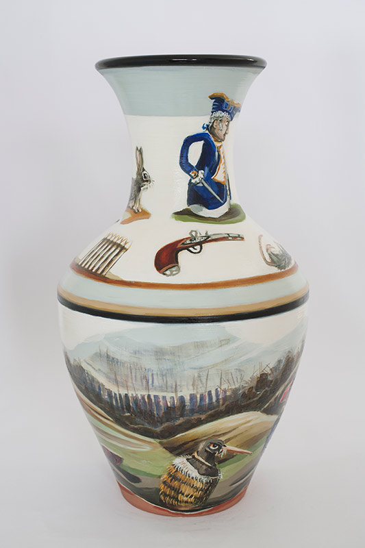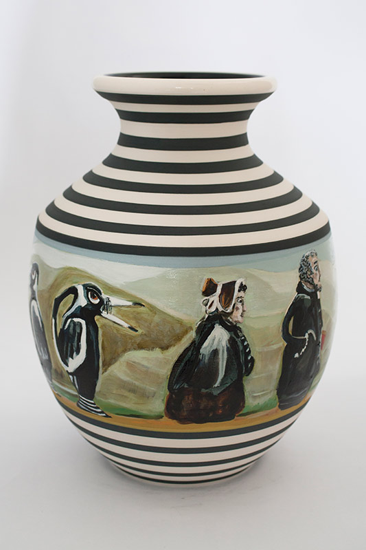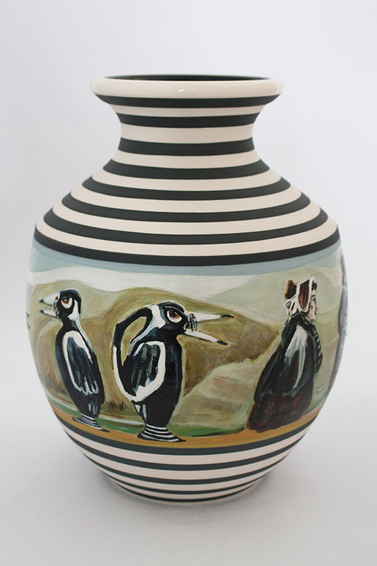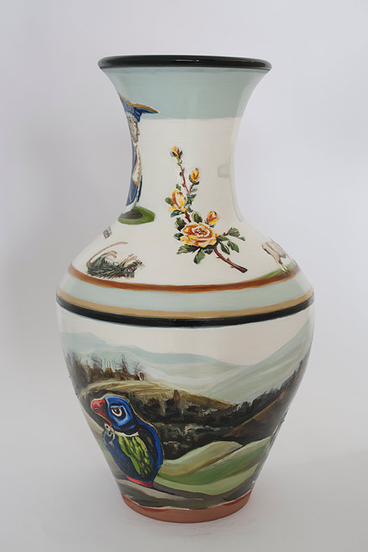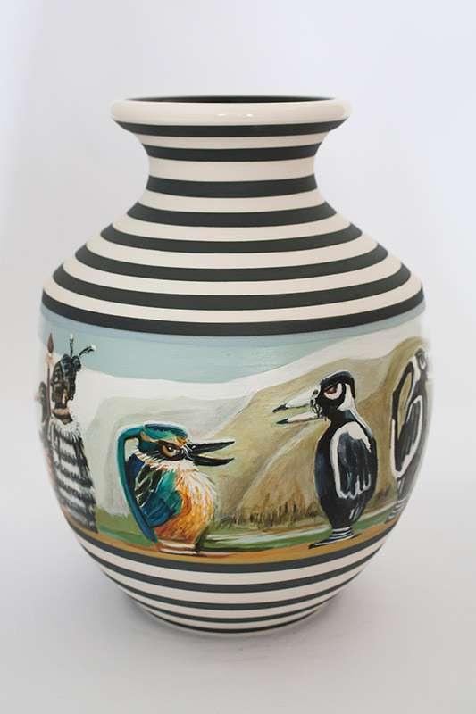 The vases created by Fran Maguire provide ideal medium and form for the expression, through Joanna Fieldes’ painting, of their shared ideas concerning the imported versus the indigenous. Containers of history link past to present while pointing to the challenges and consequences that exist today because of opportunities presented in the past.