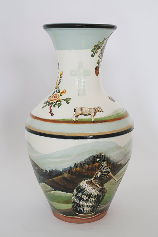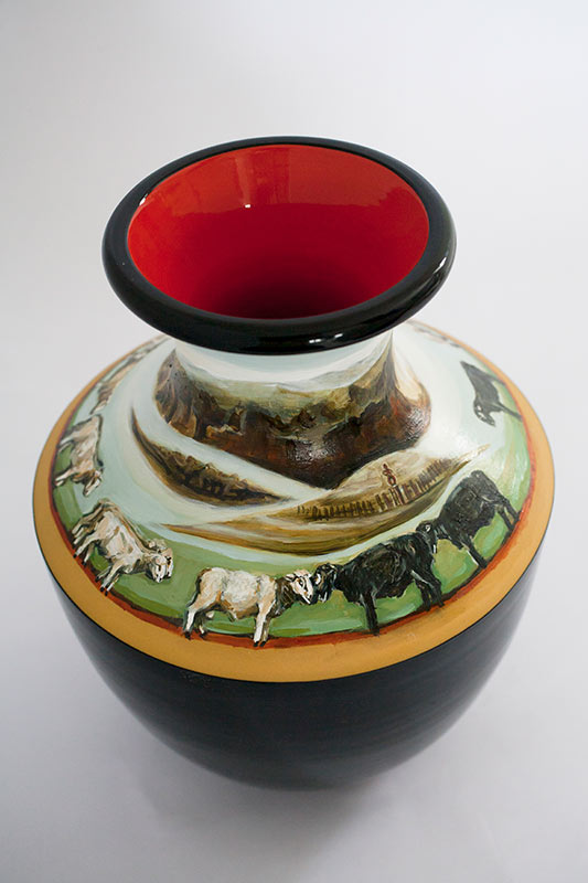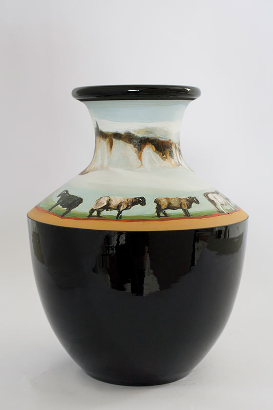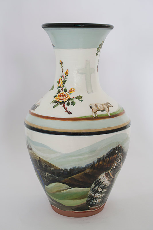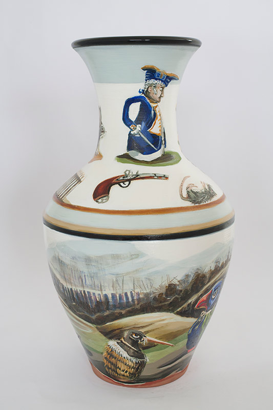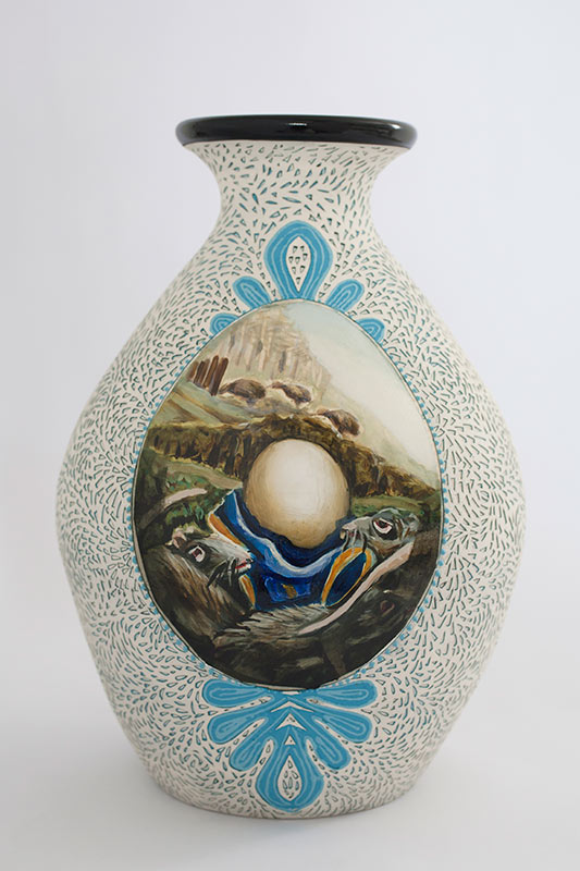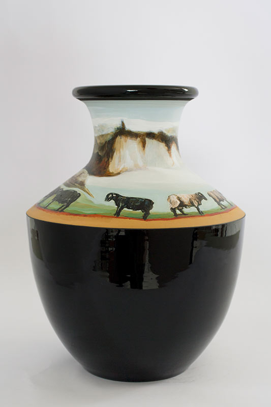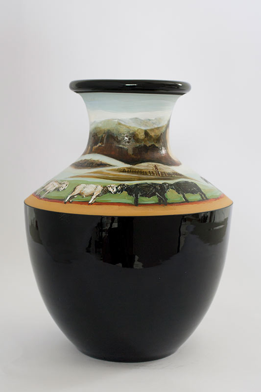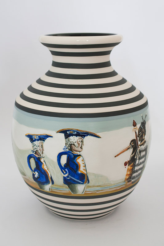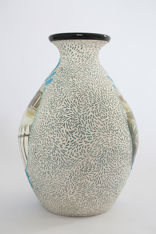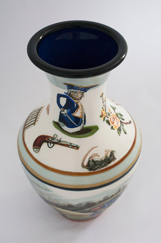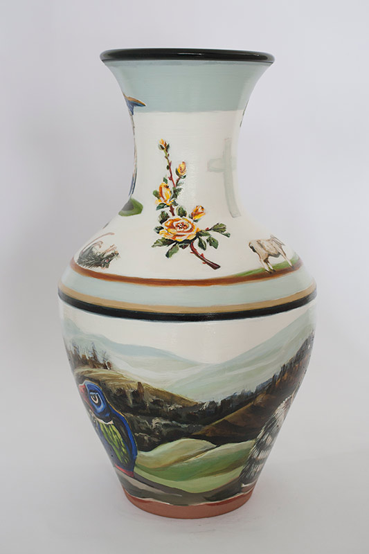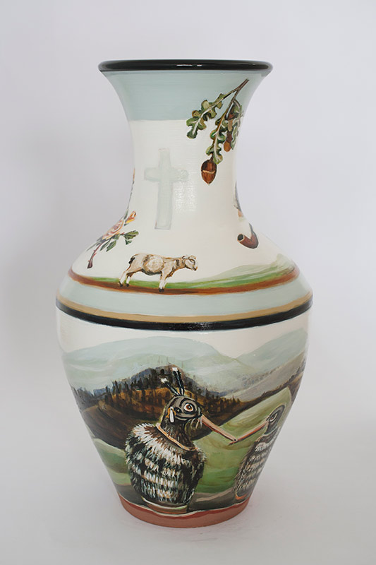 The vases created by Fran Maguire provide ideal medium and form for the expression, through Joanna Fieldes’ painting, of their shared ideas concerning the imported versus the indigenous. Containers of history link past to present while pointing to the challenges and consequences that exist today because of opportunities presented in the past.